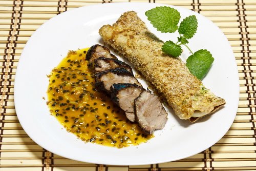 – Elkészítjük közben a maracuja szószt. A gyümölcsöket kettévágjuk és kikaparjuk. A chili paprikát apróra vágjuk, majd a gyömbért meghámozzuk és szintén apróra vágjuk. A maracuja szirupot összekeverjük a zöldcitrom levével a maracujával, a maradék szójaszósszal, a gyömbérrel és a chilivel. Körülbelül 5 percig főzzük lassú tüzön.