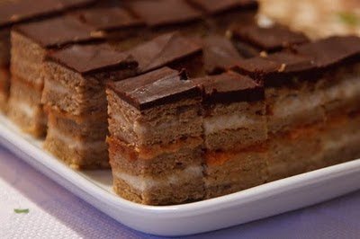 A tésztát 4 vékony lappá nyújtjuk és egy tepsiben sütőpapíron 10-13 perc alatt 180 fokon megsütjük. Mikor ezzel készen vagyunk megtöltjük a tésztát krémmel. Az alsó lapot megkenjük a mézes krémmel, aztán rátesszük a második lapot. Ezt megkenjük a felmelegített baracklekvárral, majd a mézes krémmel. A következő lapra megint a krém kerül, majd az utolsó lapot a tetejére tesszük.