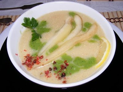 6. A levest egy botmixerrel pürésítjük. Ha szükséges még sózzuk és hozzáadunk 1 evőkanál citromlevet is. A zöldpetrezselymet vagy hozzáadjuk a leveshez és szintén beletörjük, vagy egy kevés folyadékkal együtt összepürésítjük és tálaláskor a leves tetejére tesszük. Mi az utóbbit tettük.