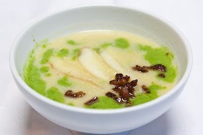7. A levest melegen tálaljuk. A tetejére helyezzük óvatosan a körtéket és a pirított szalonnát, majd megszórjuk frissen őrölt piros borssal és friss kakukkfűvel díszítjük.