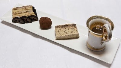Egy hosszúkás tányérra helyezzük a 3 kávés édességet és tálaljuk is.