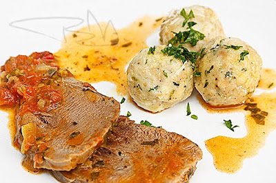 A szósszal és a zsemlegombóccal tálaljuk. A maradék petrezselyemmel díszítjük.