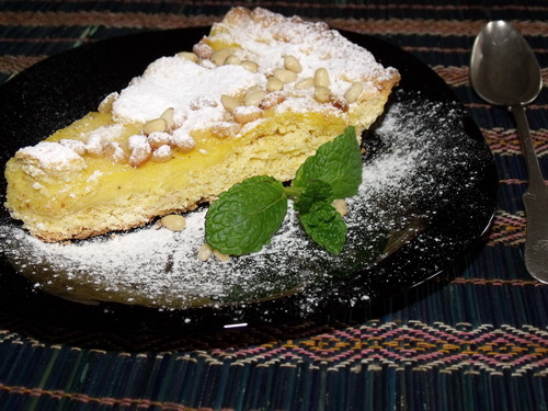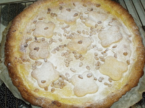 Ebben a kötetben találkoztam a Torta della Nonna (Nagymama tortája) nevű toszkán desszerttel és gondoltam kipróbálom. Az interneten 100- féle Torta della Nonna található. Végül nem Frances Mayer receptjét alkalmaztam. Ő egyébként kukoricalisztet használ és a közepébe teszi a krémet, én a tetejére tettem. Ami a legfontosabb, hogy ezt a tortát fenyőmaggal kell megszórni. A krémet az olaszok crema pasticcera-nak nevezik, ami nagyon hasonló a nálunk ismert ún. sárgakrémhez.