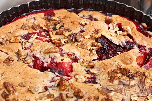 A tésztát a gyümölcsre kanalazzuk úgy, hogy hagyhatunk lyukakat is. Megszórjuk a dióval vagy a mandulával.