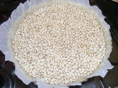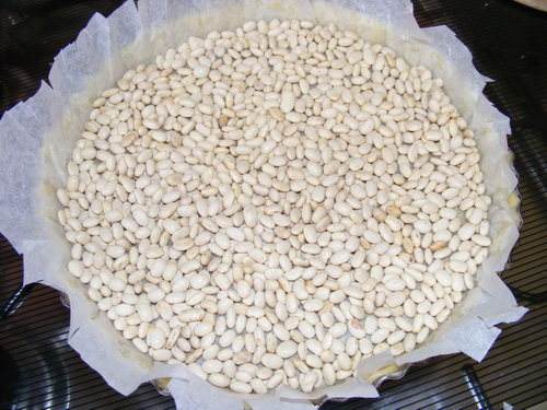 Ha szeretnénk, hogy a tészta megtartsa a formáját, akkor ráteszünk egy sütőpapírt, körbe bevágdossuk és megrakjuk szárazbabbal.