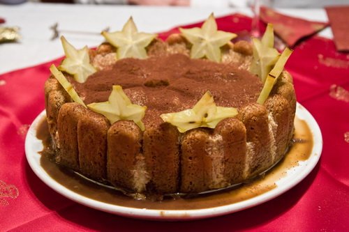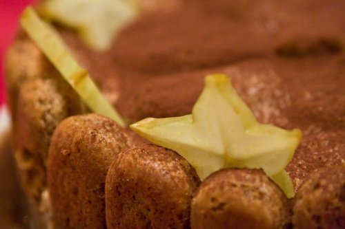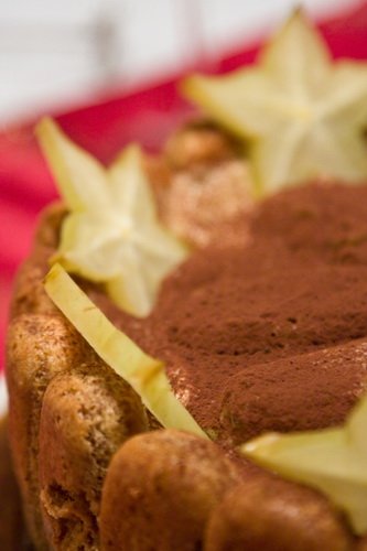 Kibélelünk fóliával egy tortaformát. A babapiskótákat méretre vágjuk. Beáztatjuk egy erős, jó minőségű kávéba. Ízlés szerint cukrozzuk a kávét, de nem kötelező. Hozzáadunk egy pici rumot. A babapiskótát addig áztatjuk, míg jó puha nem lesz. (Az eredeti recept instant kávéból szirupot készít, de nekem ez nem tetszett. A krém így is eléggé édes.) A forma alját és az oldalát is kirakjuk. A végén beleöntjük a krémet és a fagyasztóba tesszük.