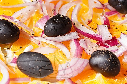 Egy tálkába kevés olívaolajat teszünk, beleszórjuk a frissen őrölt borsot és egy kevés sót. Jól összekeverjük, majd ráöntjük a narancsra.