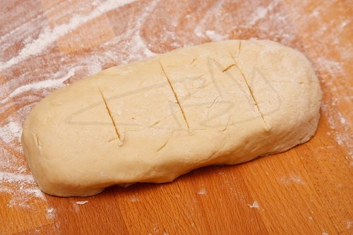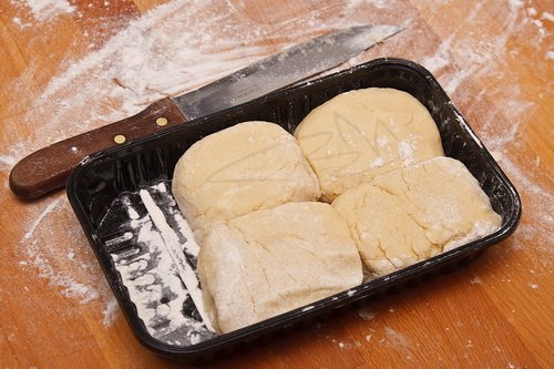 Ezután a cipókból négy lapot nyújtunk. Egyesével vesszük ki a hűtőből, csak az van szobahőmérsékleten, mellyel éppen dolgozunk.