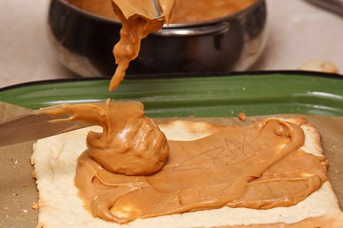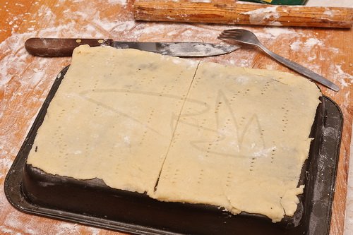 A puha vajat a szódabikarbónás liszttel elmorzsoljuk, majd rászórjuk a cukrot is. Ezután a maradék hozzávalókat is felhasználva tésztát gyúrunk. A tésztát négy részre osztjuk és betesszük a hűtőbe pihenni egy fél órára.