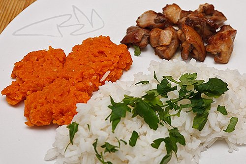 Megfőzzük a rizset és olajban erős lángon megsütjük a feldarabolt csirkecombot is.