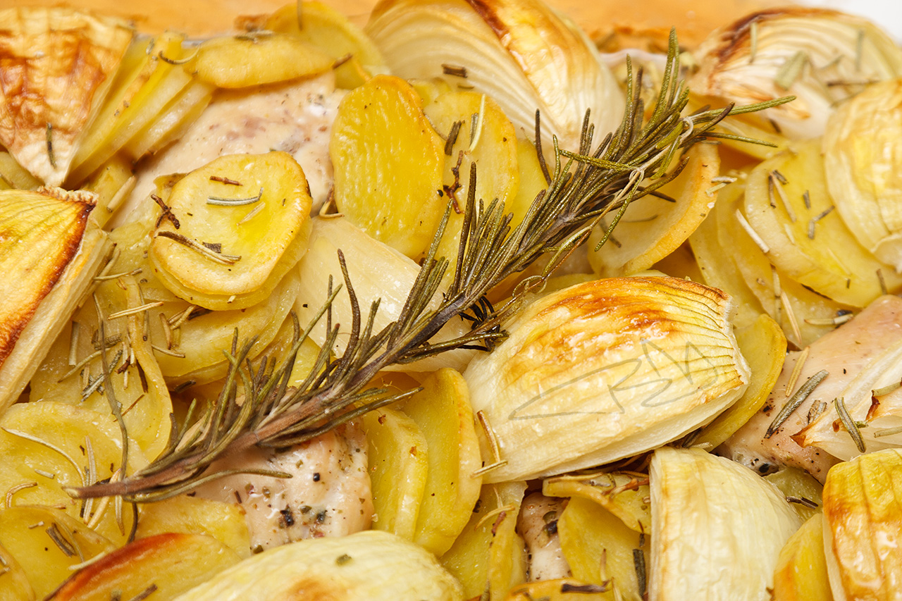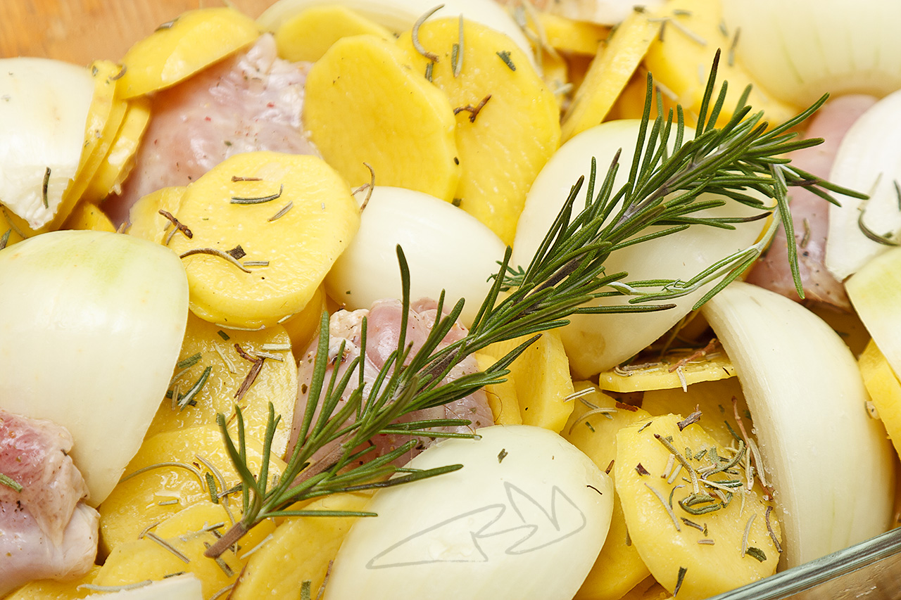 A húst kivesszük a pácból és egy tűzálló tálba tesszük. A krumplit beleforgatjuk a pácba, majd a hagymával együtt a hús mellé tesszük. A maradék páclével lelocsoljuk a húst.
