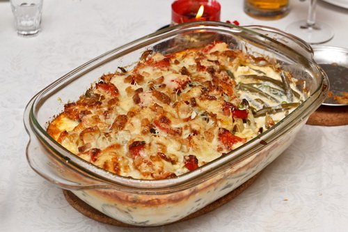 A zöldségeket belehelyezzük egy mély tűzálló edénybe. Leöntjük a tejfölös keverékkel, majd ráreszeljük a sajtot. A tetejére rárakjuk a pici vajdarabkákat.