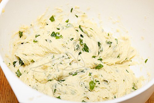 5. A maradék hozzávalókat is belekeverjük. A tejfölt, a tojássárgákat, a medvehagymát és a sót.