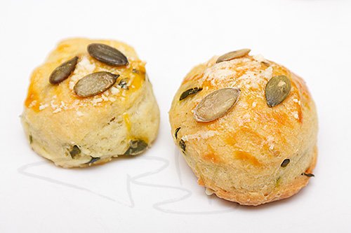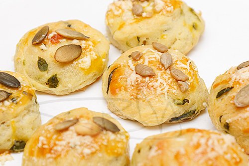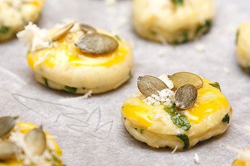10. Megkenjük a tetejüket a felvert tojással és szórunk rá reszelt sajtot és tökmagot.