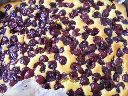 Egy nagyobb tepsi aljára sütőpapírt teszünk és megkenjük vajjal. Erre ráhelyezzük a masszát és rárakjuk a cseresznyéket is.