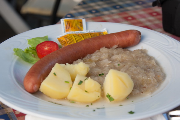 | A kolbász mustárral és savanyú káposztával. |