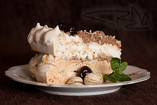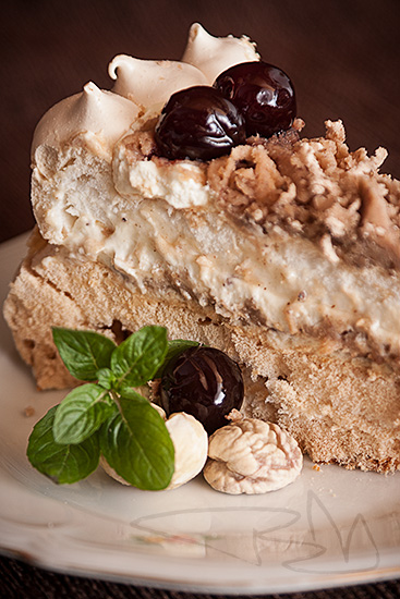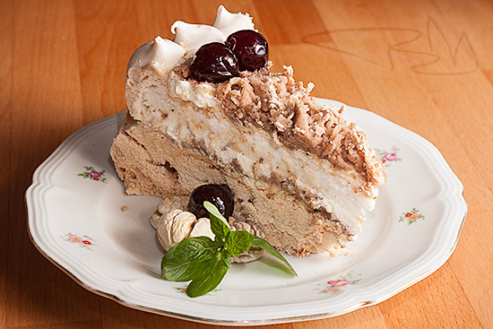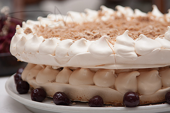 Az egyetlen problémám az volt, hogy éjjel álltam neki a süteménynek és két kört kellett sütni. Szerencsés helyzetben vagyok, mert két sütő van a konyhában, viszont az egyik nem időzíthető. A másik karika így tovább száradt mint az ideális idő. Éjjel 3- kor kellett volna kivenni a sütőből és ehelyett én hajnalban riadtam fel, hogy mi lehet a tortával. Szerencsére nem történt semmi baj, csak egy picit elszíneződött a habcsók. Így is finom volt. Mindenesetre ha tökéletes a lapunk, akkor a habcsók torta kívül ropogós és belül krémes. Nálam ez a felső réteg.