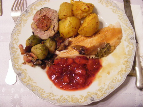 Gordon Ramsay karácsonyi pulykája Merguez kolbászos töltelékkel, (Dél- afrikai kolbász, a férjem készítette, fűszerezte a húst és töltötte. Boltban nem is hiszem, hogy kapható) chilis, kurkumás burgonyával és piros áfonyás mártással