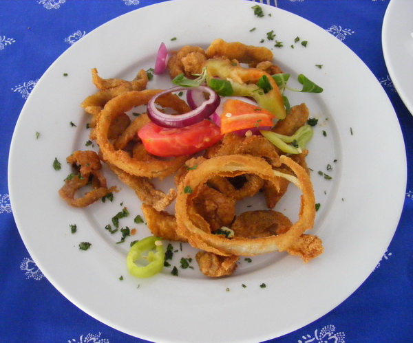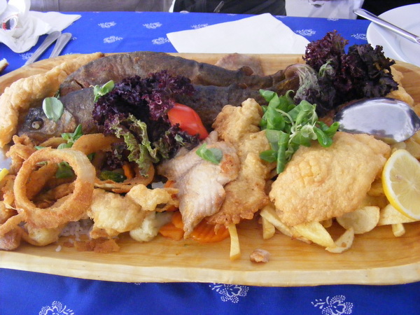 Kértünk még egy kétszemélyes vegyes haltálat. Ez kifogástalan volt és az adag inkább szólt négy személyre, mint kettőre. A tálon volt pisztráng, fogas orly módra, harcsa és ponty többféle módon elkészítve. Kaptunk mellé rizst, rántott hagymakarikákat és sült krumplit. Én külön örültem a madársalátának, sajnos a másik saláta, mely még a tálon volt, földes volt, nem volt jól megmosva. Kértünk még grillezett zöldségeket. Tetszett, hogy a zöldségek ropogósak maradtak.