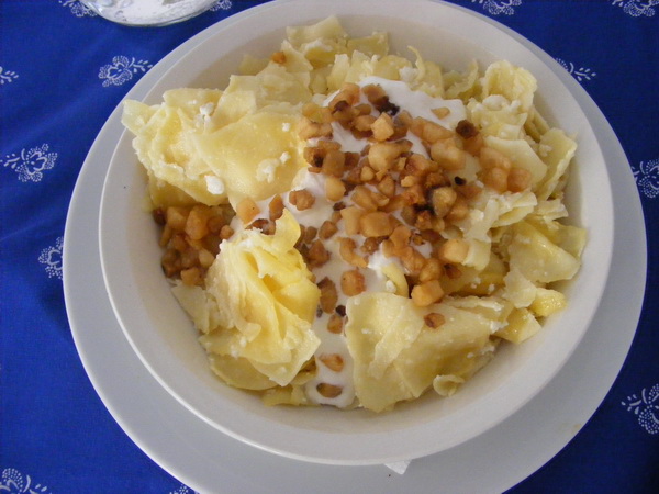 A gyerekeknek kértünk sajttal és sonkával töltött sertésbordát és túrós csuszát. Ez utóbbit el tudnám képzelni máshogyan is. Kevésbé puha tészta, több túró, több tejföl és friss kapor a tetejére. (Én úgy készítem, hogy megpirítom a szalonnát és a kieresztett levét is az ételre csurgatom.)