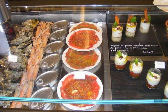 Fontosnak tartják a minőséget, nem kínálnak cukros és mesterségesen színezett üdítőket, sem aromákkal készült ételeket. Széles a borkínálat és a borokhoz választható falatkák, nyers sonkák, sajtok és halak. A kínálatot mindig a szezonhoz igazítják. Mi kávét és fagylaltot kóstoltunk valójában. A csokoládéfagylaltjuk a legjobb volt, melyet ezen a nyaraláson Olaszországban ettem. A kávé pont olyan, ahogyan szeretem, pár sötét, sűrű krémes korty a forró csésze alján, fekete és aromás, természetesen cukor nélkül keserűen.