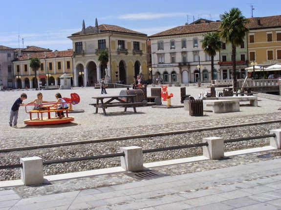 Az első városka melyet meglátogattunk még útközben az Palmanova volt, mely északkeleten fekszik Udinétől 27 km-re. A város a 16. században épült, máig megőrizte 9 szögletű formáját. 1797-ig Velence fennhatósága alá tartozott, amikor az osztrák haderő sikeresen bevette. Napóleon csapatai kiűzték az osztrákokat és elfoglalták egész Velencét. Az 1797-es békeszerződésben Napóleon a Habsburg Birodalomnak adta a várost. 1805-ben a pozsonyi béke után saját Itáliai Királyságához csatolta, majd 1814-ben a bécsi kongresszus után Velence és szárazföldi birtokai Ausztriához kerültek. Az osztrák időszak 1866-ig tartott, mikor Friuli és Veneto az Olasz Királysághoz került. Az első világháborúban az olasz haderő fontos támaszpontja volt a város. Palmanova-t 1960-ban olasz műemlékké nyilvánították. A történelméről dióhéjban ennyit kívántam leírni. Lássuk ezt a gyönyörű várost közelebbről.